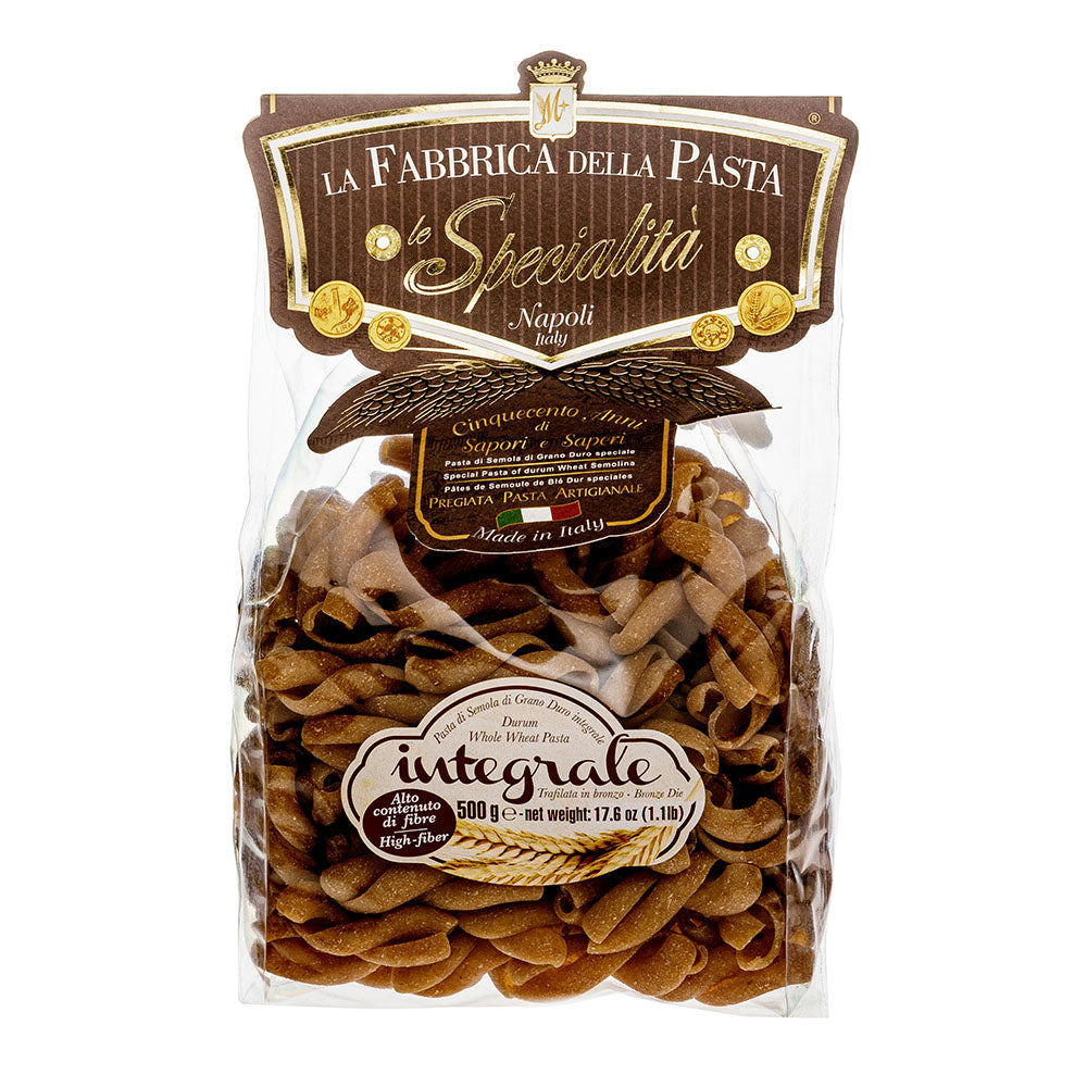 Deze stevige pasta van 100% Italiaans tarwegriesmeel geeft een perfecte volkoren ‘al dente’ bite. Doordat de volle koren is gebruikt, is de Fusilloni Integrali een geweldige bron van vezels.